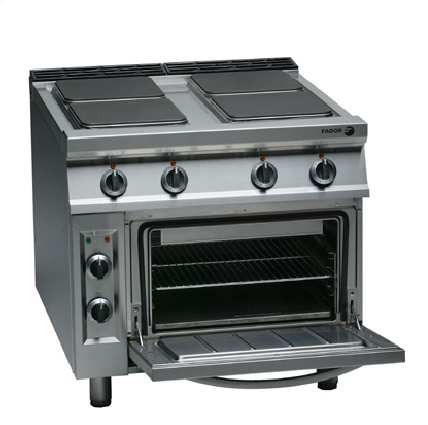 La limpieza de la electricidad con placas del más alto rendimiento. Muebles de ½ y 1 módulo, 2 ó 4 placas, 3.000 y 4.000 W. de potencia. Modelo con horno GN-2/1 inoxidable, con solera de hierro y grill, calentamiento desde la base, desde el techo o desde ambos.