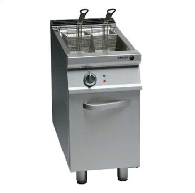 Construcción en acero inoxidable. Capacidad: 1 cuba de 20 litros de aceite. Dotación: 1 cestillo de 315x330 mm ó 2 cestillos de 315x160 mm. Regulación termostática de la temperatura de 60 ºC a 195 ºC. Encendido automático de los quemadores mediante válvula electromagnética con piloto y termopar. Termostato de seguridad. Grifo de vaciado. Conexión eléctrica: 220 V - 1+N Potencia: 21.000 kcal/h (24,4 kW). Dimensiones: 425 x 900 x 850 mm.