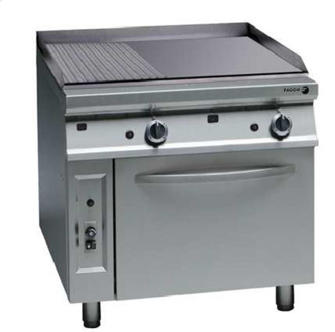 Fry-Top a Gas Con Horno FTG9-11 L Construcción en acero inoxidable. Superficie: 50 dm2. Placa de asado 2/3 lisa - 1/3 ranurada. Quemador de acero inoxidable con piloto y piezoeléctrico. Regulación termostática de la temperatura de la placa 120 ºC - 310 ºC. Bandejas recogegrasas extraibles. Horno GN-2/1 de acero inoxidable, con quemador de acero inoxidable de 8.000 Kcal/h, con piloto de encendido y termopar. Válvula termostática (130 ºC - 350 ºC). Potencia: 26.000 kcal/h (30,2 kW). Dimensiones: 850 x 900 x 850 mm.